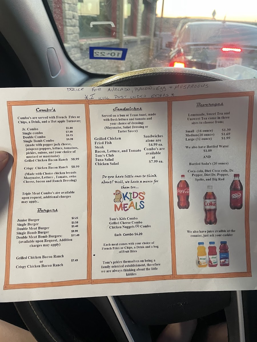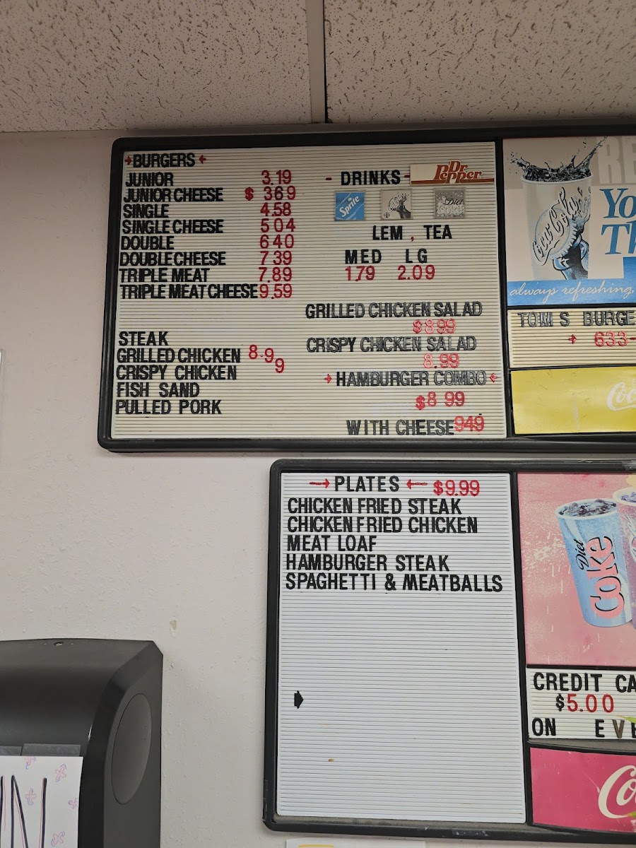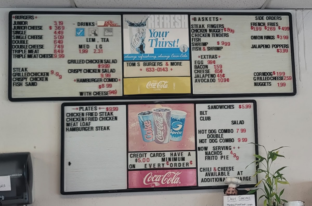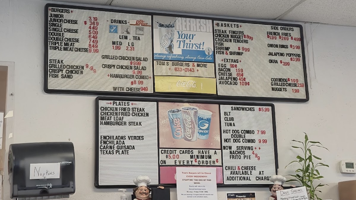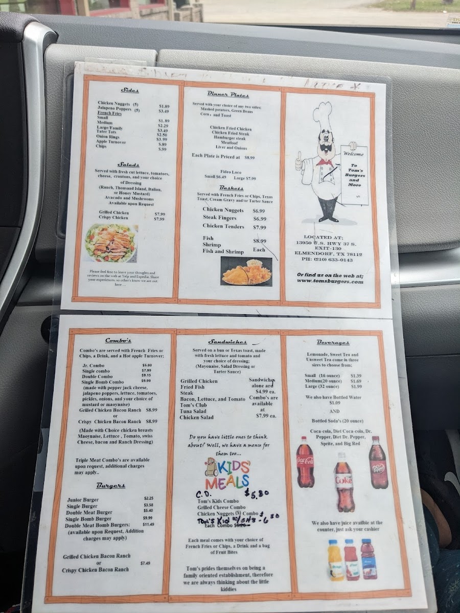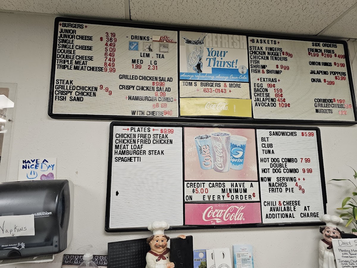 At Tom's Burgers & More, you're in for a treat. Located at 13950 I-37 in Elmendorf, TX, this spot is all about comfort food done right. From classic, juicy burgers to tasty sides, there’s something for everyone. Whether you're in the mood for a fresh, hand-crafted burger or some hearty fries to go with it, Tom's Burgers & More Menu has got you covered. The variety will have your mouth watering, and each dish is made with care to keep you coming back for more. The menu offers a delightful mix of flavors that’ll satisfy any craving, making it a great choice for a casual meal or a quick bite on the go.